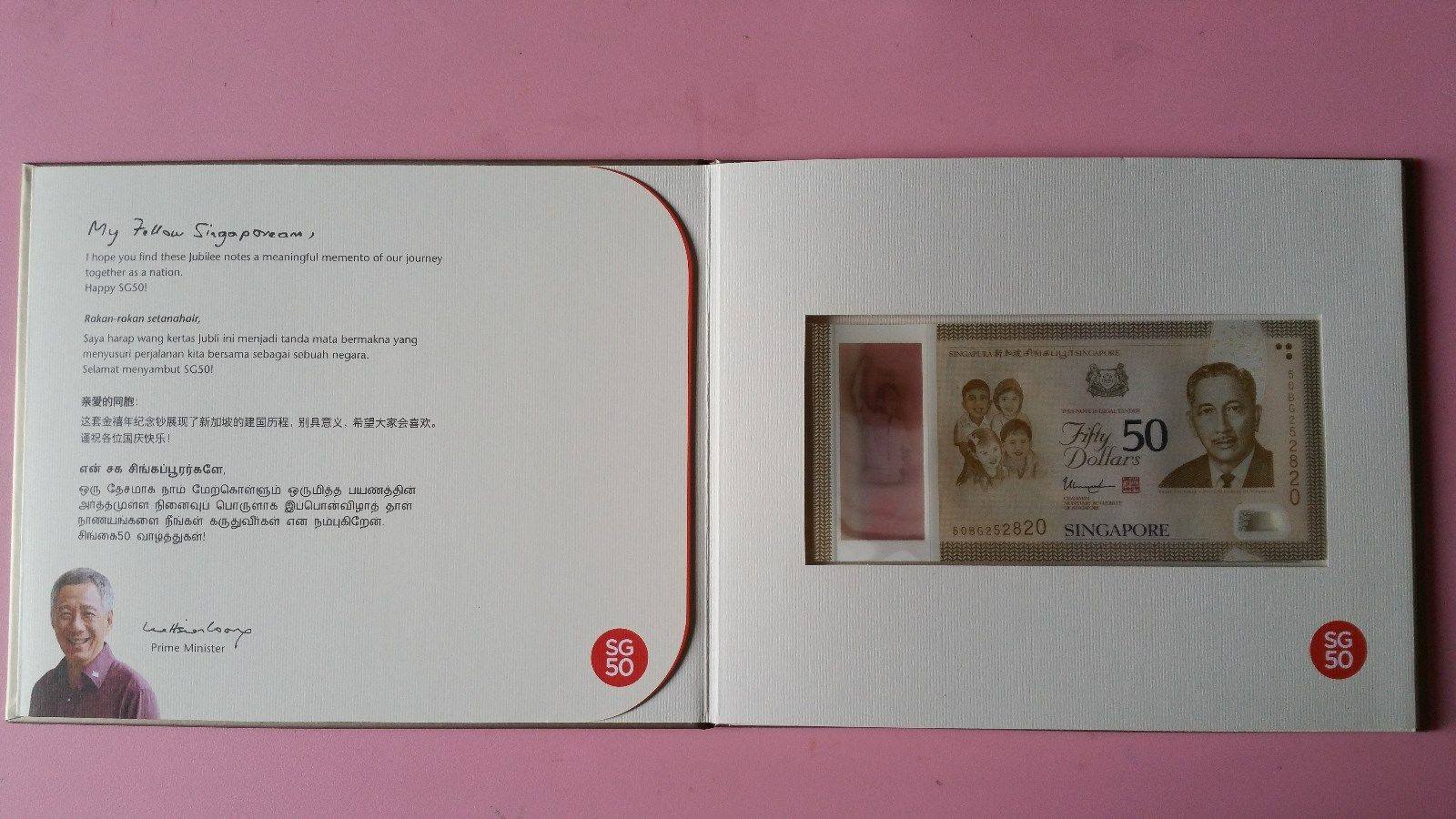 Những lưu ý $ 50 nêu bật lịch sử, chuyển đổi và tương lai của Singapore. Nó cho thấy cuối Mr Lee Kuan Yew, Thủ tướng đầu tiên của Singapore, la lớn: "Merdeka!" - Những lời kêu gọi của cuộc đấu tranh giành độc lập của chúng tôi. Những lưu ý làm cho sử dụng đặc biệt của vàng màu sắc, phản ánh Golden Jubilee của Singapore.